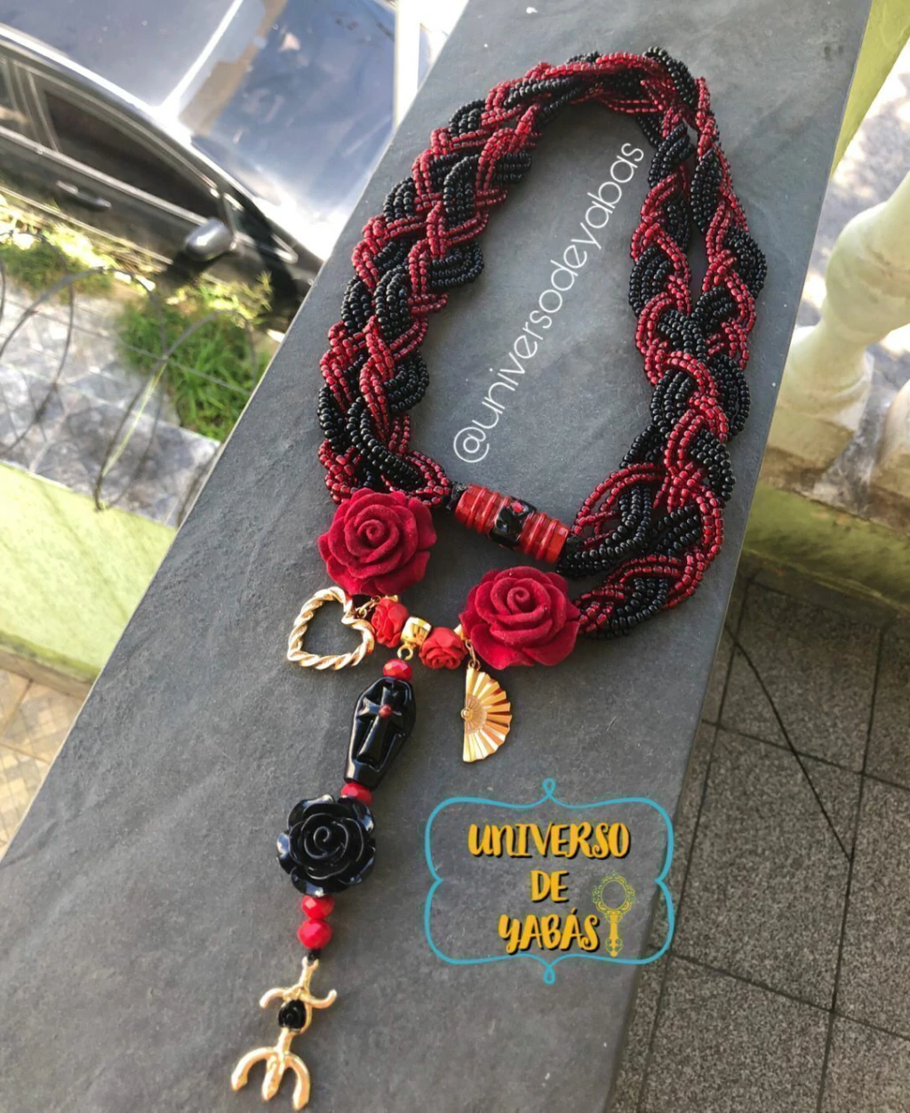 Guia Luxuosa para Pomba Gira 7 Fios Trançada nas vibrantes cores vermelho e preto, esta guia é adornada com rosas vermelhas e uma elegante rosa preta. Os pingentes dourados em forma de coração, tridente e leque adicionam um toque de sofisticação. Os detalhes em murano no caixão e no fechamento tornam este amuleto ainda mais especial.